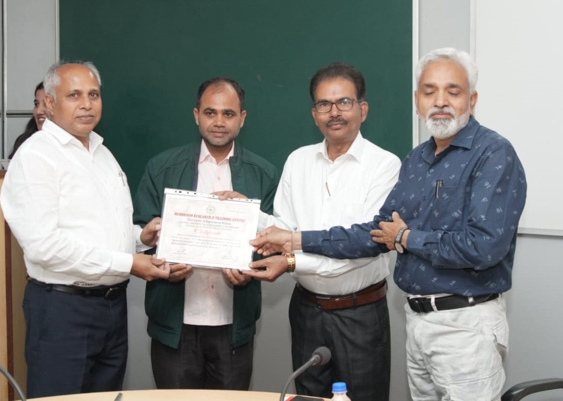 Programme coordinator Dr SK Mishra provided practical training on compost preparation, spawn production, crop room management, and preparation of mushroom-based value-added products. Practical sessions on pest and disease management were also conducted to provide hands-on experience to participants. A total of 54 trainees from four states participated in the programme. During the training, scientists provided detailed information on modern production techniques of button, oyster (dhingri), and milky mushrooms. At the closing ceremony, certificates were distributed to all participants by the Chief Guest and Guest of Honour. Students and staff of the Mushroom Research Centre were also present on the occasion.