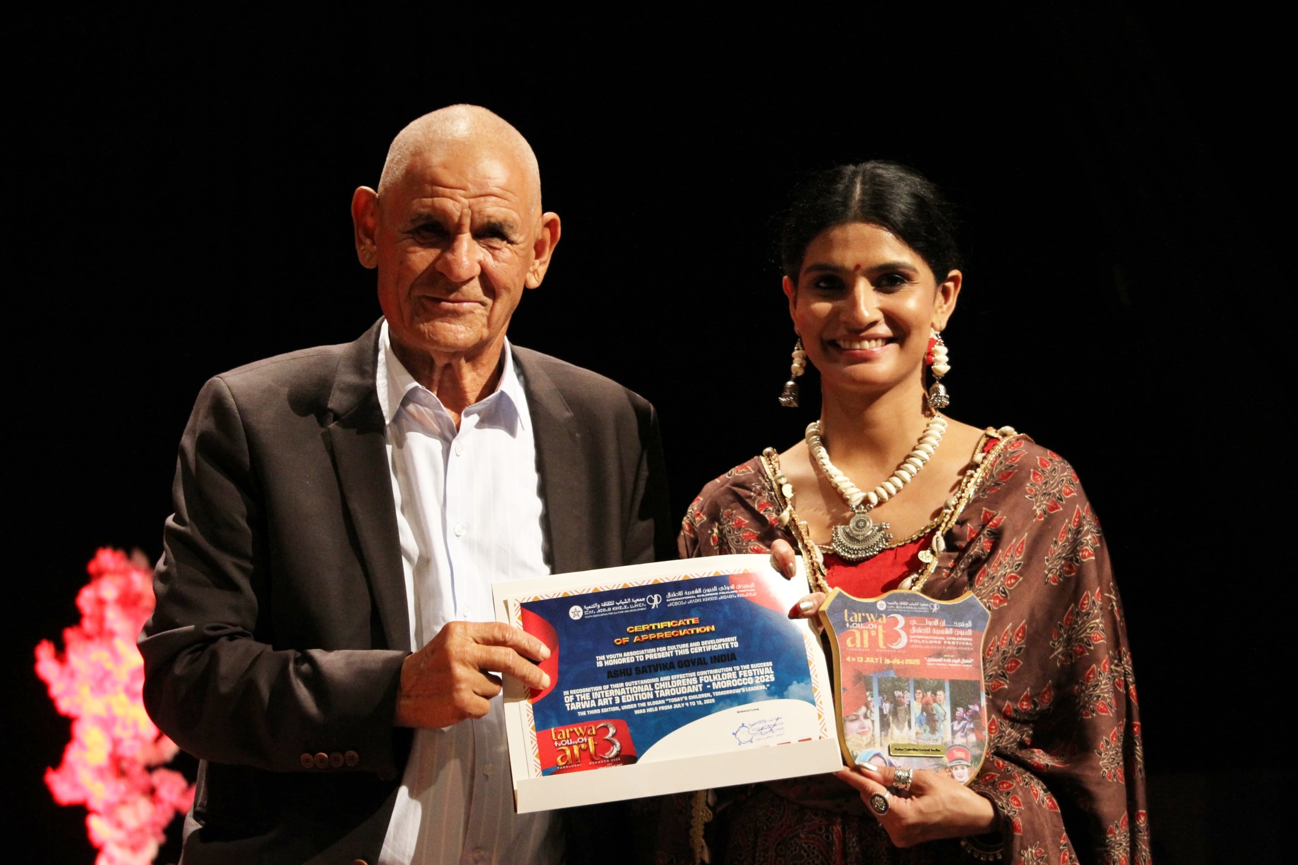 Taroudant, Morocco, 21 Dec: Ashu Satvika Goyal was formally honoured for her outstanding artistic leadership at the International Children’s Folklore Festival – Tarwa Art 2025, held in the city of Taroudant, Morocco. She was the only participant selected from India and was chosen from across the world as the sole artist entrusted with independently directing the entire festival in the role of Artistic Director. The festival was organised by the Youth Association for Culture and Development (YACD).
