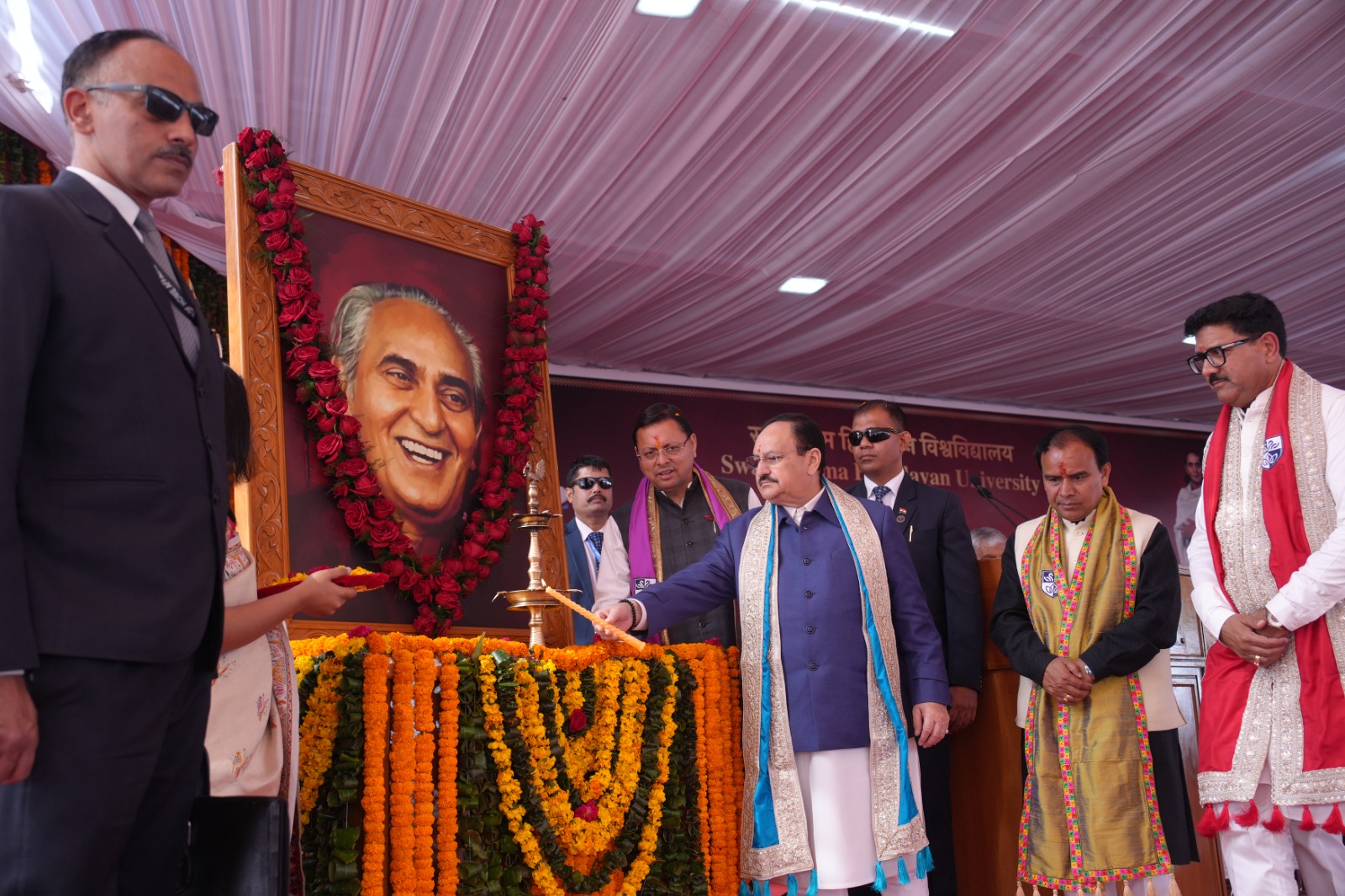 DEHRADUN, 14 Feb: The eighth Convocation ceremony of Swami Rama Himalayan University, Jolly Grant, was held with dignity and grandeur in the presence of Union Minister for Health & Family Welfare and Minister for Chemicals & Fertilisers Jagat Prakash Nadda as the Chief Guest and Uttarakhand Chief Minister Pushkar Singh Dhami as the Guest of Honour.
