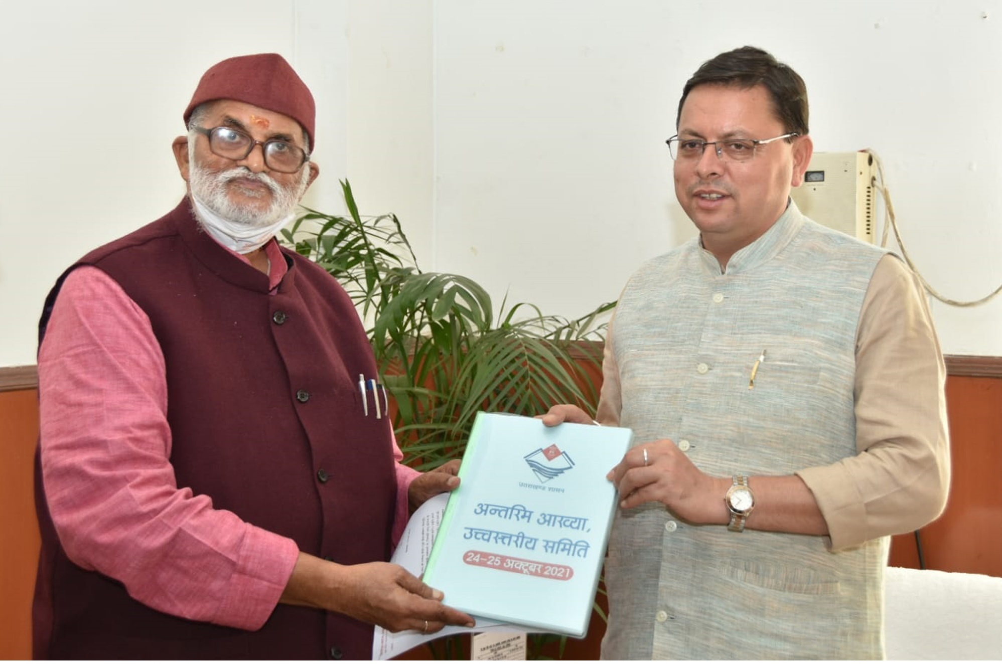 Dehradun, 25 Oct: Chairman of the High Level Committee constituted regarding Devasthanam Board, Manohar Kant Dhyani submitted an interim report to Chief Minister Pushkar Singh Dhyani, here, today.Dhyani had called on the CM at his office at the Secretariat to submit the report.