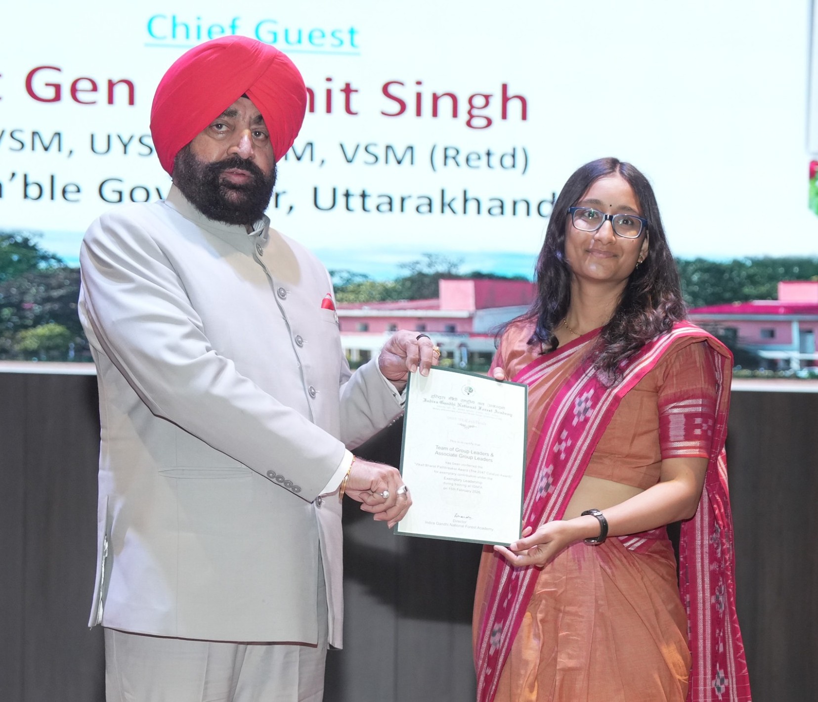On the occasion, the Governor honored the parents of late Sanjay Singh, Ghanshyam Narayan Singh and Kanti, by presenting them with shawls. He also felicitated officers of the 2025 batch for outstanding performance during training. The event was attended by Director Bharti, PCCF (HoFF) Uttarakhand Ranjan Kumar Mishra, other academy officials, and trainee officers.