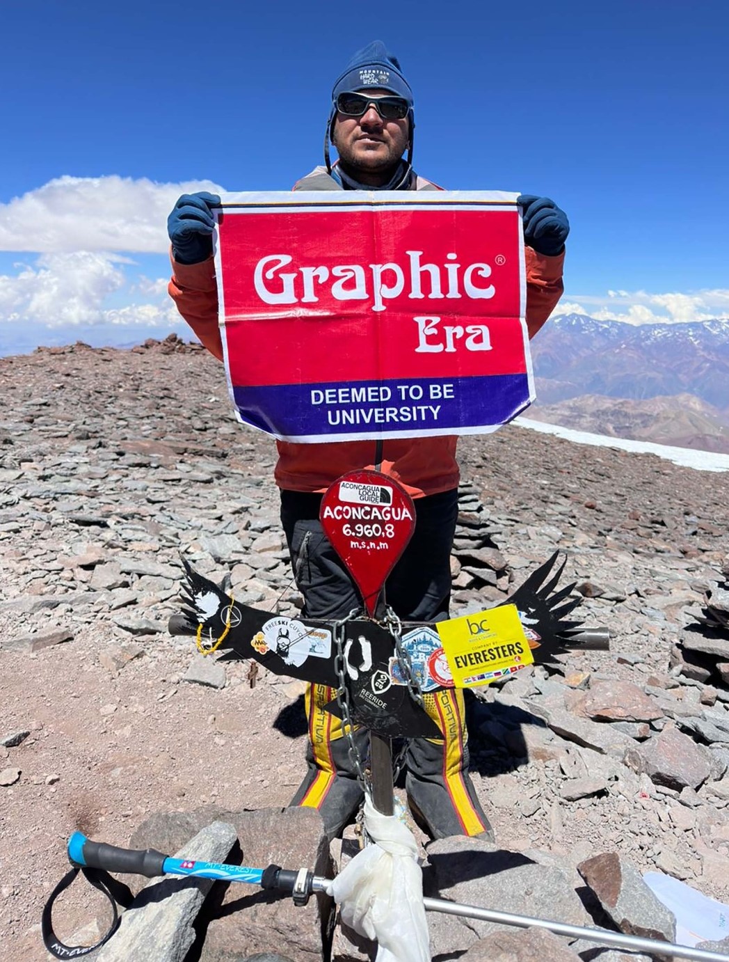Dehradun, 6 Feb: The Graphic Era flag has been hoisted on the highest peak of South America. Mountaineer Rajendra Singh Nath hoisted the flag of Graphic Era by conquering Mount Aconcagua for the second time.