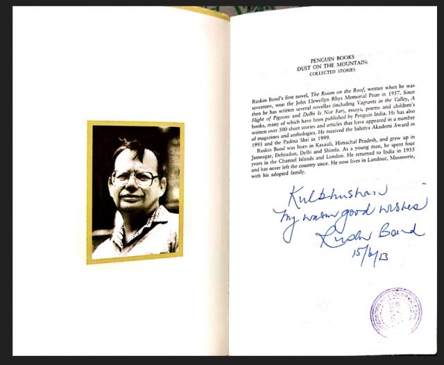 I took the book and had a look at it. It was a compilation of short stories written by him, called ‘Dust on the Mountain’. On its first page he had written very neatly, “Kulbhushan, My warm and good wishes. Ruskin Bond”.