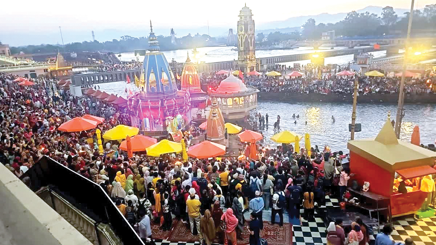 Haridwar, 14 Apr: The sacred city of Haridwar today witnessed a huge crowd of devotees gathering at different ghats for the ritual of Ganga Snan on the occasion of Baisakhi. The devotees arriving from distant parts of the country thronged Har Ki Pauri and other ghats, taking holy dips in the Ganga to earn spiritual merit, while similar scenes were reported along various riverbanks where pilgrims performed ritual bathing.