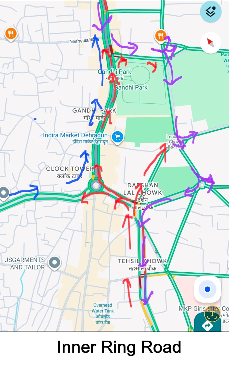 - Inner Ring Road: Dehradun needs an inner ring road, where traffic moves without any crossings and traffic lights. It can easily be made by simply making some roads around the Clock Tower one way. As shown in the diagram below, the road between Darshan Lal Chowk to Clock Tower becomes one way towards Clock Tower, with the traffic splitting between those wishing to go towards Chakrata Road and those who would go towards Astley Hall. The entire traffic from Chakrata Road turns towards Astley Hall. From Kwality Chowk to Kanak Chowk to Lansdowne Chowk and then Buddha Chowk and back to Darshan Lal Chowk are all one way, as shown in the diagram.