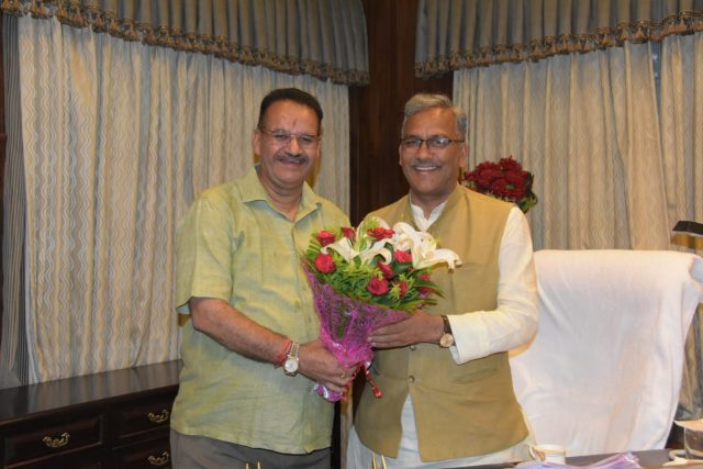 DEHRADUN, 10 Jul: Mussoorie MLA Ganesh Joshi expressed gratitude to Chief Minister TS Rawat by presenting him a bouquet of flowers at the latter’s official residence, here, today. He thanked the CM for the recent Cabinet decision to relax construction norms in Mussoorie, permitting buildings to be 12 metres in height. Joshi had led a delegation of Mussoorie residents, recently, that met the CM and requested to provide this relaxation. The MLA said that the people of the hill town were pleased with the decision that had met a long pending demand. The MLA reminded that the municipal area of Mussoorie and 13 revenue villages in the proximity were in the ‘freeze zone’, where construction is permitted for permanent residents only in 100 square metres of area, and 150 square metres in the undeveloped areas. No master plan is in force in this area. Joshi said that the relaxation would help in the development of necessary infrastructure, small houses, etc. It would also give a boost to tourism, reducing the burden of tourists in the core zone. He also requested that the one-time settlement plan also be approved by the Cabinet.