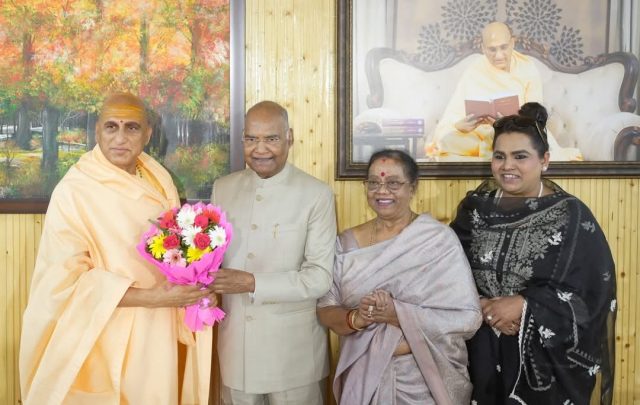 Haridwar, 26 May: Former President of India, Ram Nath Kovind visited Harihar Ashram in Kankhal, here, today, during a two-day personal pilgrimage along with his family. At the ashram, he sought blessings from Swami Avdheshanand Giri of the Juna Akhara and later also interacted with the media, sharing his perspectives on key national issues.