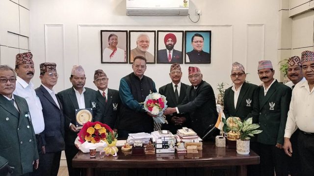 Dehradun, 16 Nov: Minister of Soldier Welfare Ganesh Joshi met a delegation of ex–servicemen from Gorkha Rifles 2/5 (FF) at his camp office in Dehradun on Saturday. On this occasion, Captain Khem Bahadur Thapa, the Vice President of the ex–servicemen association, presented a memento to Joshi on behalf of the Gorkha Rifles 2/5 (F.F.) to commemorate the battalion’s 138th Raising Day. The ex–servicemen informed the Minister that their battalion is the only one to have three recipients of the prestigious Victoria Cross.