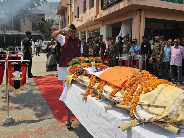 Haridwar, 27 Apr: Soldiers’ Welfare Minister Ganesh Joshi today paid heartfelt tribute by laying a wreath on the mortal remains of Rifleman Sameer Ale (aged 26), a resident of Dehradun and a soldier of the 6/5 Gorkha Rifles, who attained martyrdom while on duty during training activities in Siliguri.