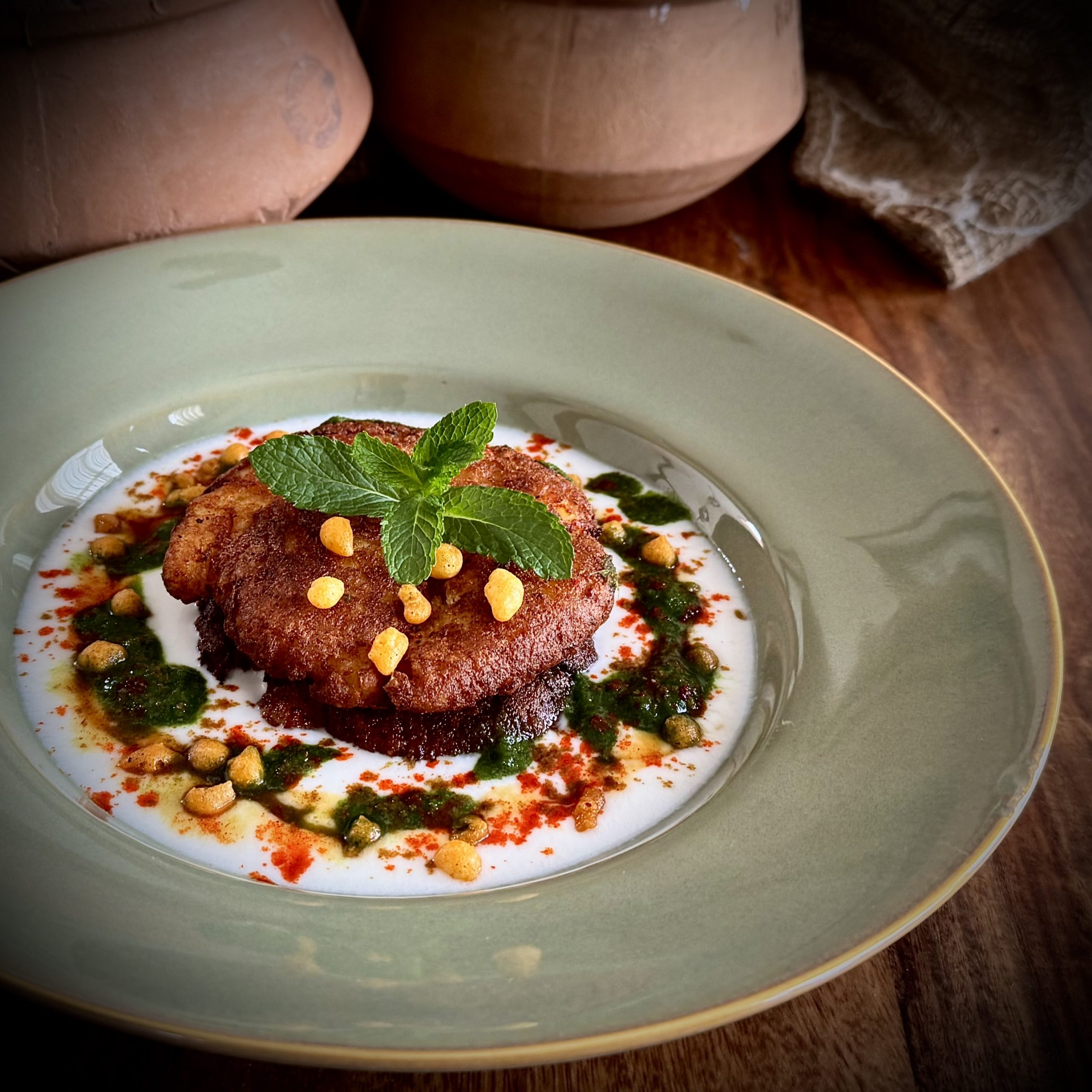 - Over the hot tikkkis pour the curd, drizzle mint and tamarind chutneys.